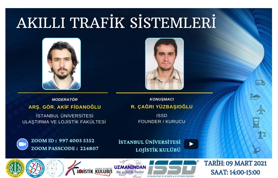 İstanbul Üniversitesi Lojistik Kulübü olarak “UZMANINDAN” serisinde bu haftaki konuğumuz “Akıllı Trafik Sistemleri” konu başlığı altında ISSD Kurucusu Sn. R. Çağrı YÜZBAŞIOĞLU olacaktır. Lojistiğin zaman ve yer kapsamını doğrudan ve dolaylı olarak etkileyen trafik yönetimi üzerine koordinasyon, optimizasyon ve simülasyon çalışmaların konuşulacağı etkinliğimiziz moderatörlüğünü Fakültemiz Öğretim Görevlisi Arş. Gör. Akif FİDANOĞLU üstlenecektir. Etkinliğimiz eş zamanlı olarak Youtube kanalımızda yayınlanacaktır.