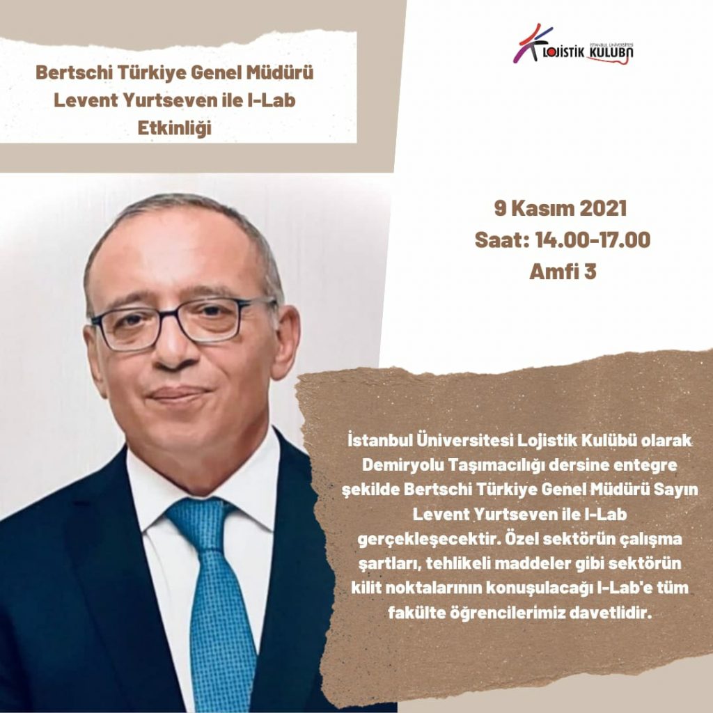 İstanbul Üniversitesi Lojistik Kulübü olarak Demiryolu Taşımacılığı dersine entegre şekilde Bertschi Türkiye Genel Müdürü Sayın Levent Yurtseven ile I-lab gerçekleştirilecektir. Özel sektörün çalışma şartları, tehlikeli maddeler gibi sektörün kilit noktalarının konuşulacağı I-Lab’e tüm öğrencilerimiz davetlidir.