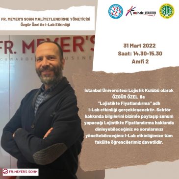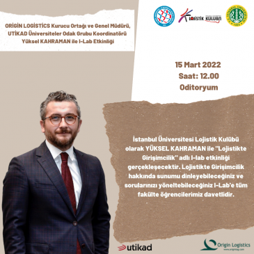 İstanbul Üniversitesi Lojistik Kulübü olarak LOGISTIFY CO-FOUNDER’LARI AYTAÇ AKGÜL ve OZAN ŞAHİNER ile “Lojistikte Girişimcilik” adlı I-Lab etkinliği gerçekleştirilecektir. Sektör hakkında bilgilierini bizimle paylaşıp sunum yapacağı Lojistikte Girişimcilik hakkında dinleyebileceğiniz ve sorularınızı yöneltebileceğiniz  I-Lab etkinliğimize tüm fakülte öğrencilerimiz davetlidir.