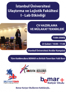 Yaptığı etkinlikler ve işbirlikleri ile kulüp üyelerine ve okul öğrencilerine büyük avantajlar sağlayan İstanbul Üniversitesi Lojistik Kulübü olarak,bahar döneminin ilk etkinliği olan CV Hazırlama ve Mülakat Teknikleri konulu i-Lab etkinliğimizi duyurmaktan mutluluk duyarız.