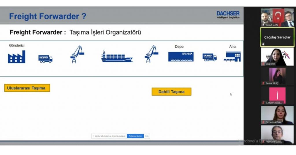 - oturumda Dachser Turkiye İzmir şube müdürü Sn. Çağdaş SARAÇLAR konuştu. Kısaca özgeçmişinden bahsettikten sonra lojistik sektörü için; “Lojistik sektörü, Türkiye’de büyümenin üzerinde gelişen bir sektör. Büyüme %5 ise, lojistik sektörü %7 büyüyor ve hiç altında kalmıyor. Bu durum yatırımlarda artışı beraberinde getiriyor.” dedi. Daha sonra Türkiye’nin coğrafi konumu üzerinde duran Çağdaş Saraçlar, “Avrupa’ya olan yakınlığımız ve ticari faaliyetlerimiz sebebiyle, Avrupa’nın en büyük kara filosuna sahip ülke durumundayız. Coğrafi konumun diğer önemi de ülkemizin 3 tarafı denizlerle çevrili. Bu anlamda deniz ticaretinin faaliyet anlamında önemini fazlasıyla görüyoruz.” dedi ve konuşmanın sonuna doğru öğrenci arkadaşlarımıza staj ve iş hayatı adına tavsiyeler vererek soruları yanıtladı.