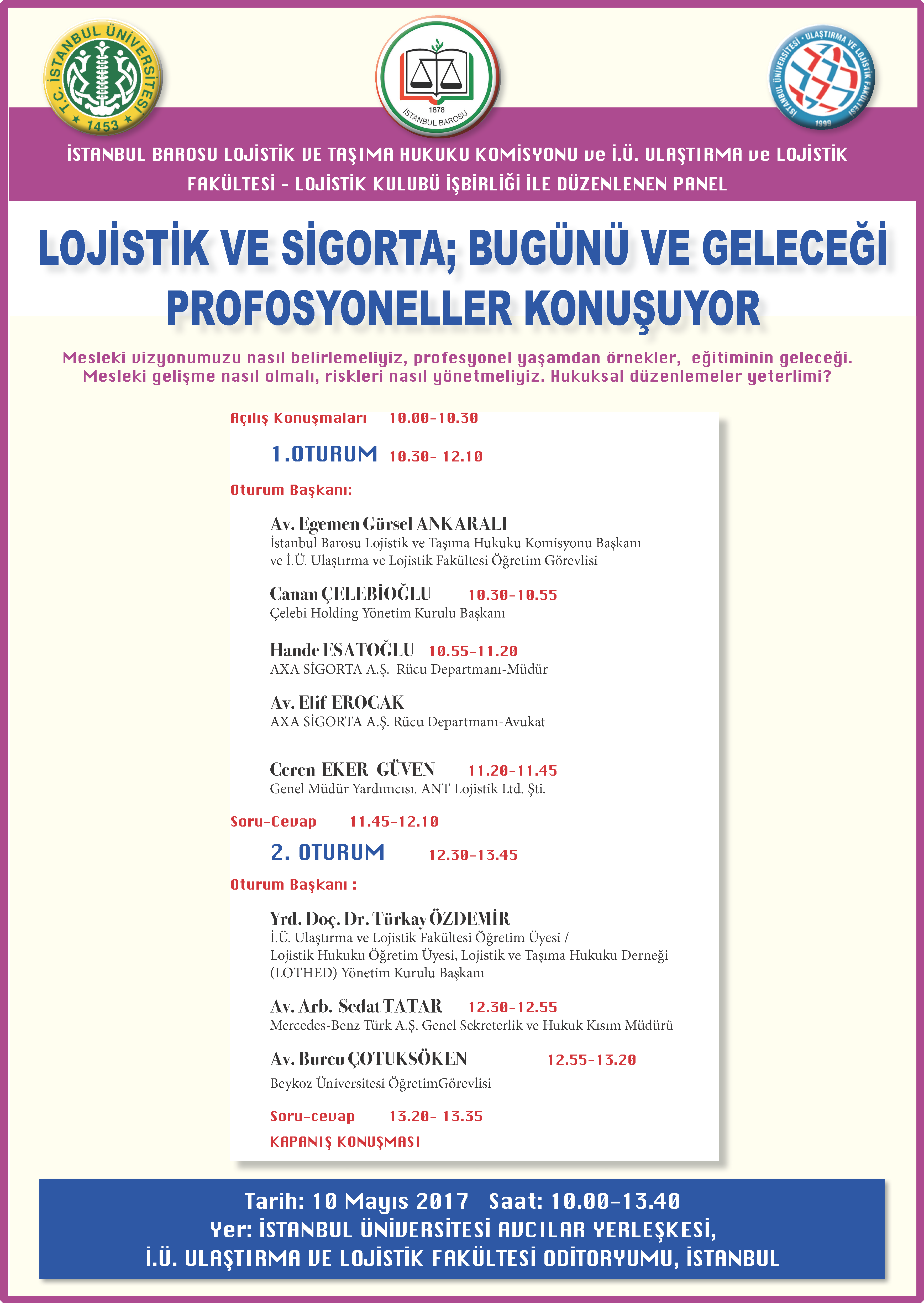 10 Mayıs 2017 tarihinde İstanbul Barosu Lojistik ve Taşıma Hukuku Komisyonu ile İstanbul Üniversitesi Ulaştırma ve Lojistik Fakültesi-Lojistik Kulübü işbirliği ile Lojistik Fakültesi oditoryumunda düzenlenecek Lojistiğin Bugünü ve Geleceği konulu panelimize ilişkin program akışı yandaki gibidir. Etkinlik günü fuaye alanında Çelebi Holding ve ANT Lojistik standlarını yer alacaktır.