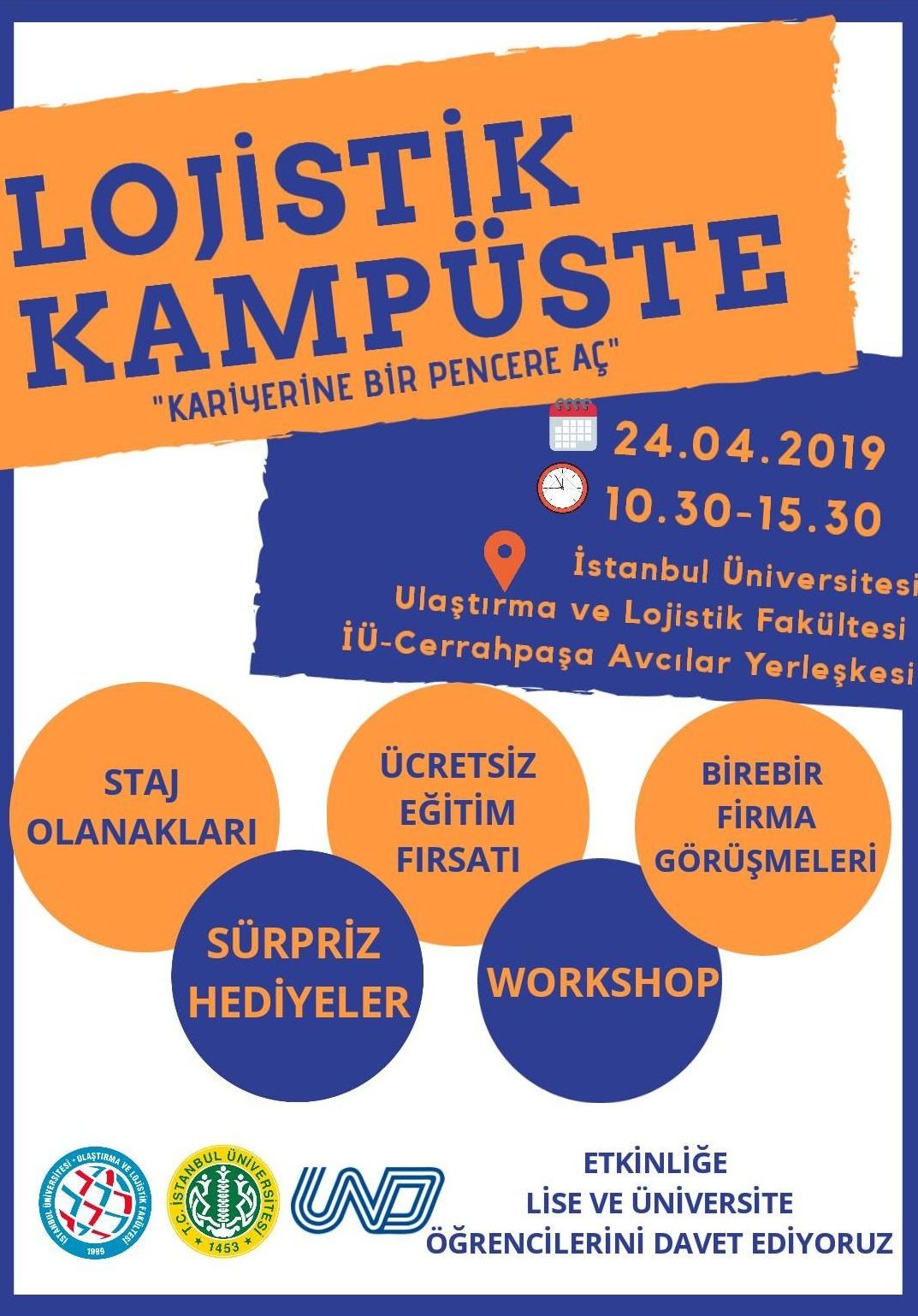 İstanbul Üniversitesi Ulaştırma ve Lojistik Fakültesi ile Uluslararası Nakliyeciler Derneğinin ortaklaşa gerçekleştireceği Lojistik Kampüste adlı Kariyer Günlerinde tüm lise ve üniversite öğrencilerinin sektöre adım atması hedefleniyor. 24 Nisan 2019 tarihinde saat 10.30-15.30 arasında İÜ-Cerrahpaşa Avcılar Yerleşkesi Ulaştırma ve Lojistik Fakültesinde gerçekleşecek olan öğrenci-sektör buluşmasında Lojistik sektörünün önde gelen firmaları stantlarını açarak bizlerle bir araya gelecek. Firmalar ile birebir görüşme şansı bulacağımız ve staj olanaklarına erişebileceğimiz bu etkinlikte çeşitli workshoplar,ücretsiz eğitim ve sürpriz hediyeler katılımcıları bekliyor.