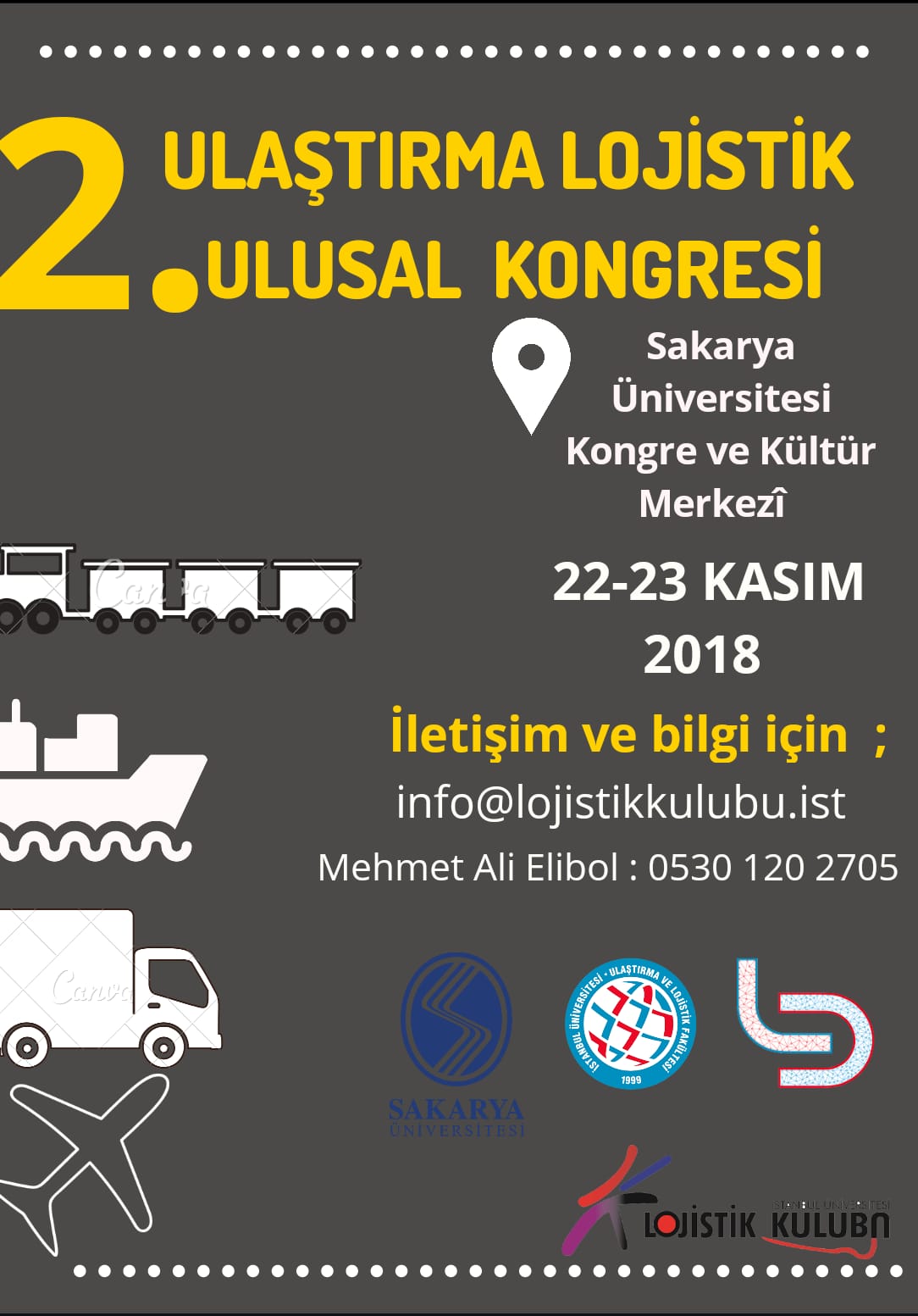 Geçtiğimiz yıl ev sahipliği yaptığımız Ulaştırma ve Lojistik Ulusal Kongresinin 2.si bu sene Sakarya Üniversitesi’nde 22-23 Kasım 2018 tarihinde gerçekleşecek.İstanbul Üniversitesi Lojistik Kulübü olarak destek vermek üzere bizde Sakarya’da olacağız. Fakültemiz öğrencilerinden bizimle birlikte 2.Ulaştırma ve Lojistik Ulusal Kongresi’nde bulunmak isteyen arkadaşlarımızı bekliyoruz.