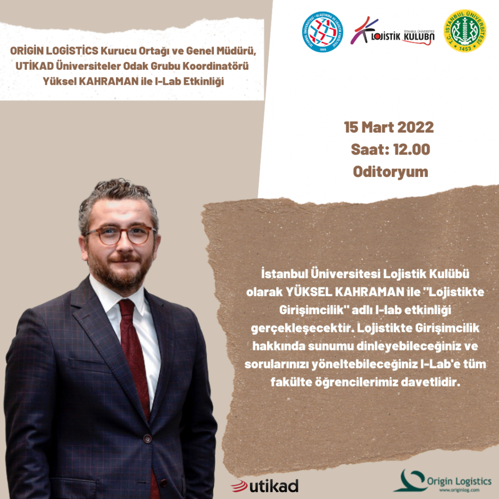 Origin Logistics Kurucu Ortağı ve Genel Müdürü, UTİKAD – Association of International Forwarding and Logistics Service Providers Üniversiteler Odak Grubu Koordinatörü Yüksel Kahraman ile 15 Mart Salı günü saat 12.00’de oditoryum salonunda “Lojistikte Girişimcilik” konu başlığı altında bir I-Lab gerçekleştireceğiz. Tüm fakülte etkinliğimize davetlidir.