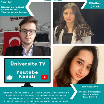 İstanbul Üniversitesi Lojistik Kulübü olarak ÜniversiteTV ‘nin canlı yayın konuğuyduk. Fakültemizi, kulübümüzü, sektörü, etkinliklerimizi konuştuk. Verimli ve çok keyifli bir yayındı. ÜniversiteTV ekibine, moderatör Mihriban hanıma sıcak ve samimi karşılaşmalarından dolayı çok teşekkür ederiz.